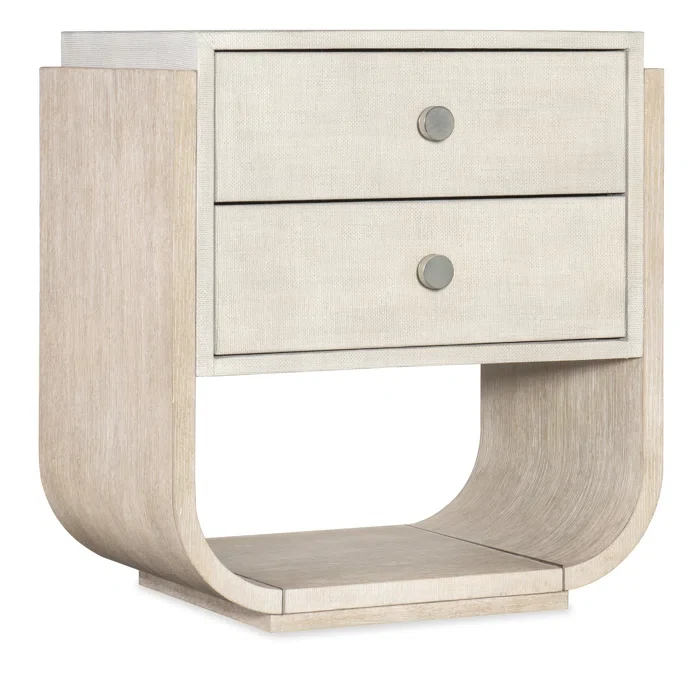 A study in shape, this two-drawer nightstand pairs a sculptural silhouette with rustic elements, creating a statement piece for your bedroom. The minimal solid + engineered wood frame features a wire-brushed finish that highlights the natural wood grain, while the drawer fronts and top are wrapped in raffia and accented with brushed pewter knobs. The drawers glide smoothly and have a soft-close mechanism, making it easy to access your essentials. We love how the rounded, U-shaped base cradles the drawers for a floating effect. Plus, there's room on the surface for a lamp and accent pieces.