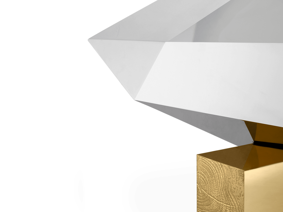 Projected to be the jewel in the crown of the Portuguese brand Boca do Lobo, the Diamond Center Table is a reflection of the furniture jeweler’s expertise and quintessence, undoubtedly deserving its title. This opulent object, full of resources and desire, has two carefully sculpted doors that reveal a gold lined interior with shelves and two drawers.
