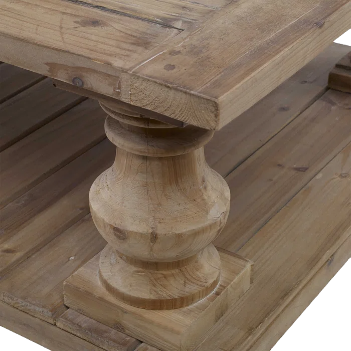 Blending sophisticated and rustic aesthetics, this coffee table is the finishing touch to your classic living room. Made from sun-faded salvaged lumber in a distressed stony gray wash finish, this coffee table strikes a chunky, rectangular silhouette with hand-turned baluster column posts and bracket feet.