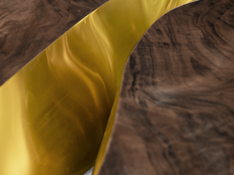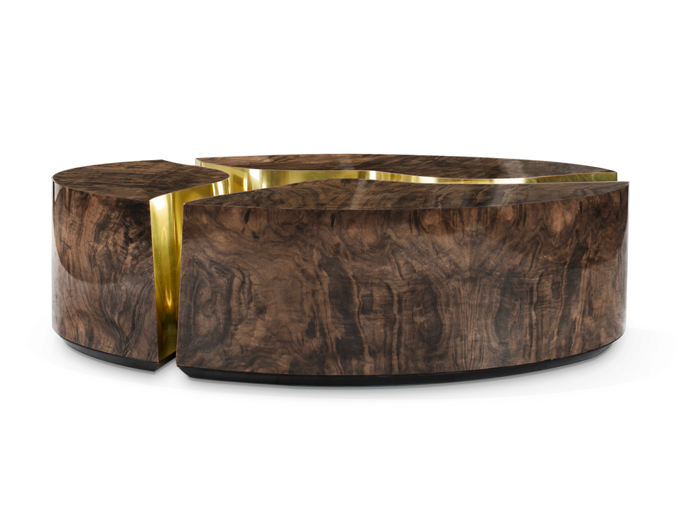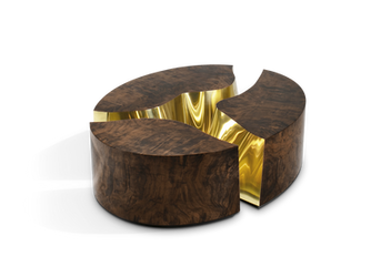 A functional artwork conceived in three modules for unexpected combinations. Its organic features are achieved through the manual fitting of the polished brass sheet, and a curved exterior finished in warmth walnut wood veneer. The hammered brass details and mirrored sides convey both dynamics and elegance to bring a new contemporary verve into refined interiors. Finding beauty in the most unexpected places, this contemporary coffee table is inspired by authentic karst formations created by surface dissolution, freezing, or thawing of dolomite rocks. Born from cold and freshly cracked to showing off the world rich, golden interior.