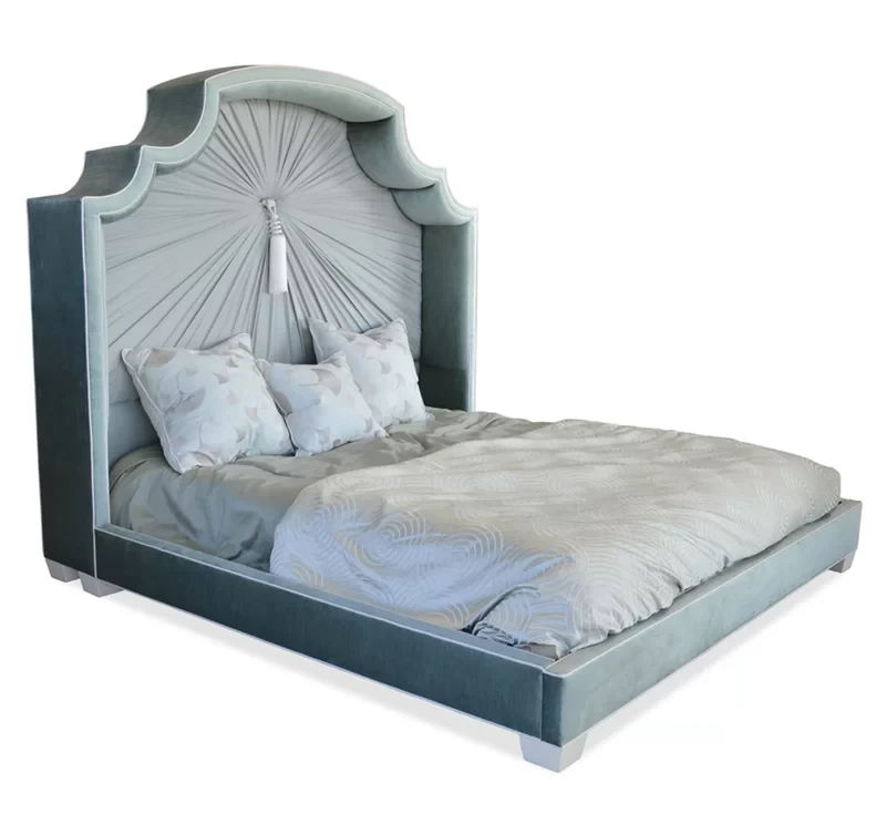 Namur "teal" velvet with cream taffeta welt, seafoam silk, white tassel, and white legs. When you are good, you are very good, but when you are bad, you are horrid. When you aren’t struggling to keep your aliases straight or dying your hair yet another color, you are catching up on your beauty sleep. This Regency Hooded Bed is just what you need to rest up for the next round of role-playing.