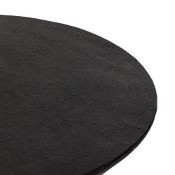 Made from cast aluminum with a raw black finish, a soft, voluminous Y base supports a drum-style tabletop with natural highs and lows.