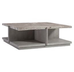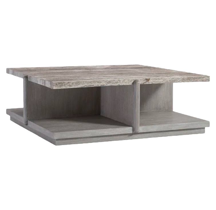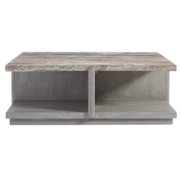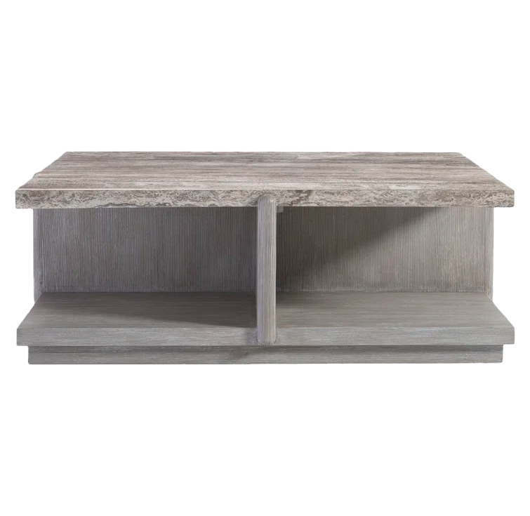 The Sereno cocktail table has a partitioned wood base that offers open storage in a textured Grigio finish. The center panels rise up to support and intersect with the silver travertine stone top. The result is a fresh perspective on modern rustic design.