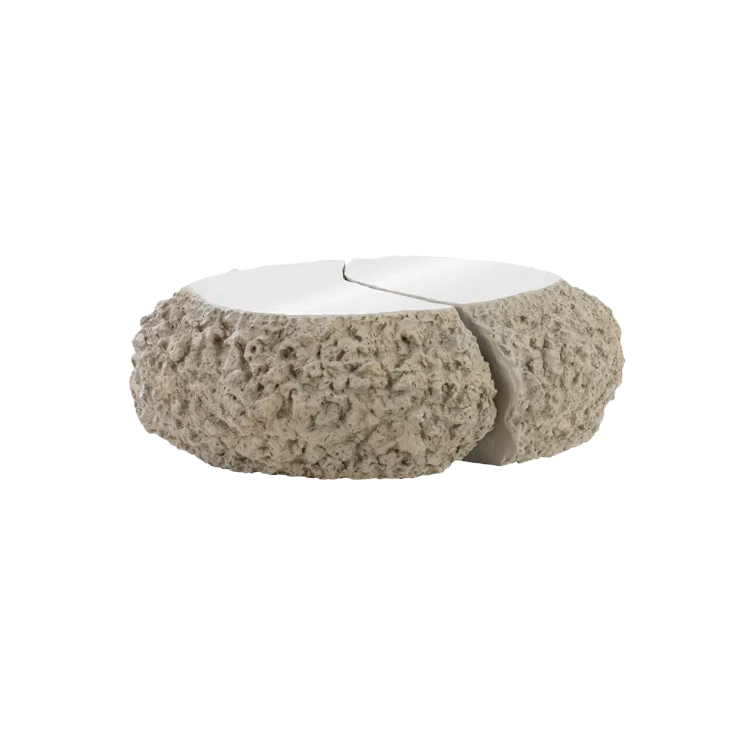 Plate tectonics: a natural force so powerful, that it shapes the very ground we stand on. Ash split the difference coffee table simulates a solid chunk of lava stone being torn asunder from the constant friction of tectonic plates located far below the Earth’s crust. Made from a combination of resin and crushed stone and then finished in an ashen gray, this elemental statement piece is beautifully contrasted with a remarkable chrome-finished stainless steel surface that delivers a modern take on this naturally inspired motif.