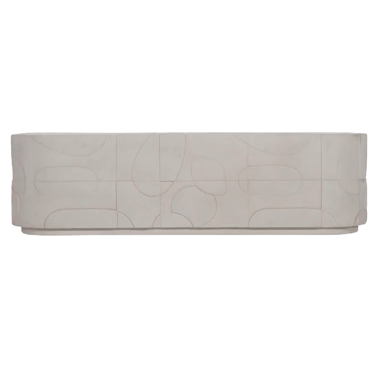 The striking cylindrical Zina cocktail table has carved sides featuring straight lines and organic curves. It is crafted of stonecast with shallow basin shaped top and resting on a plinth base. Its a modern textural statement that is both exotic and familiar.