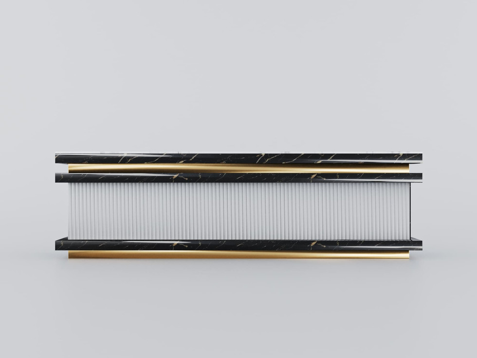 The main materials of this modern bar counter are Marble Formica, Wood, accented by copper-colored bases and wooden details. The result is an eclectic yet chic collection that easily fits into any aesthetic.